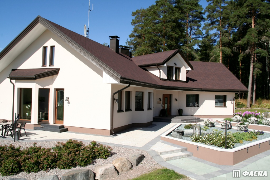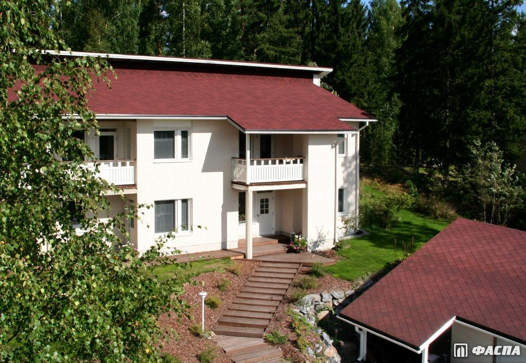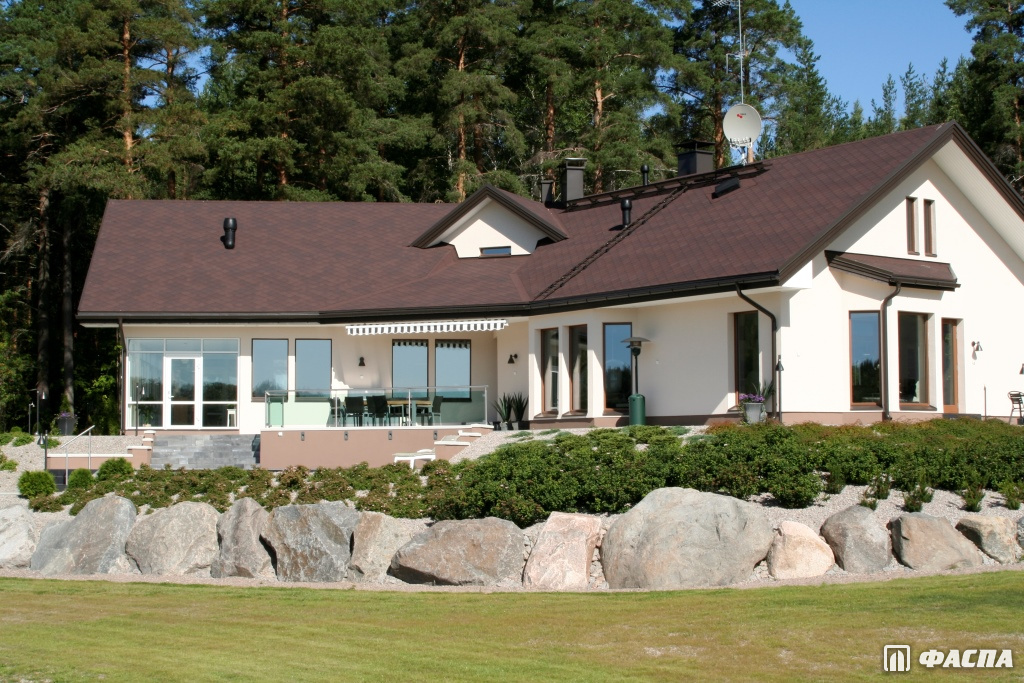 Битумная черепица Katepal прекрасно гармонирует со зданиями, оформленными в современном и классическом стиле. Особенно выигрышно смотрится сочетание кровля «Катепал Фокси» + фасад хай-тек. В целом любой архитектурный замысел может быть воплощён с применением мягкой черепицы финского бренда.