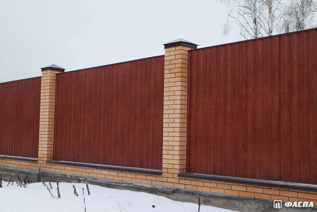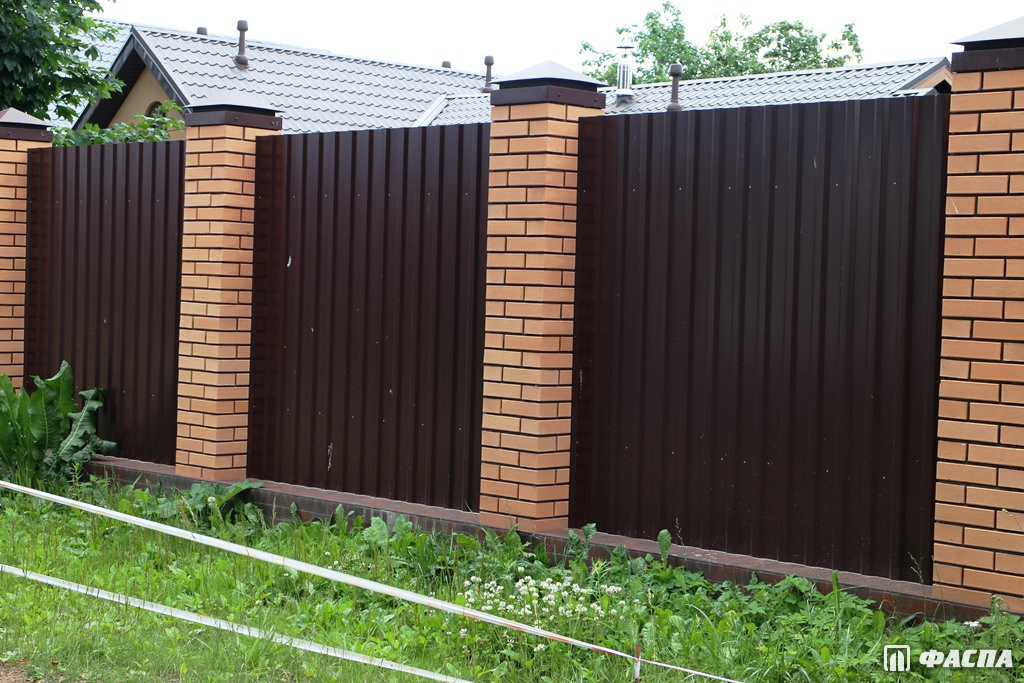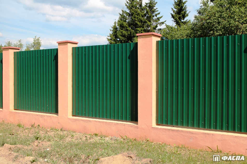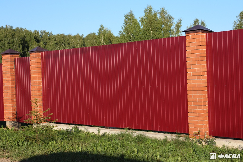 Чтобы забор смотрелся эстетично и красиво как с улицы, так и со двора, используйте для строительства двухсторонний профнастил. Материал изготовлен из стального листа толщиной 0,4–0,5 мм. Преимущества нанесения полимерного покрытия с двух сторон отражаются не только в эстетических качествах. Состав дополнительно защищает металл от негативных внешних воздействий, повышает прочность — ограждение прослужит вам не один десяток лет.